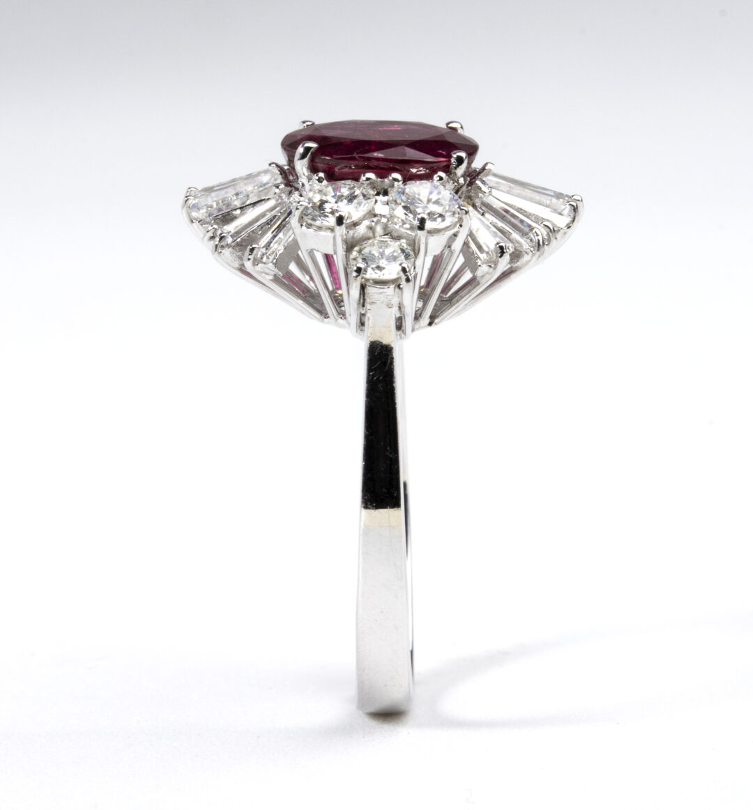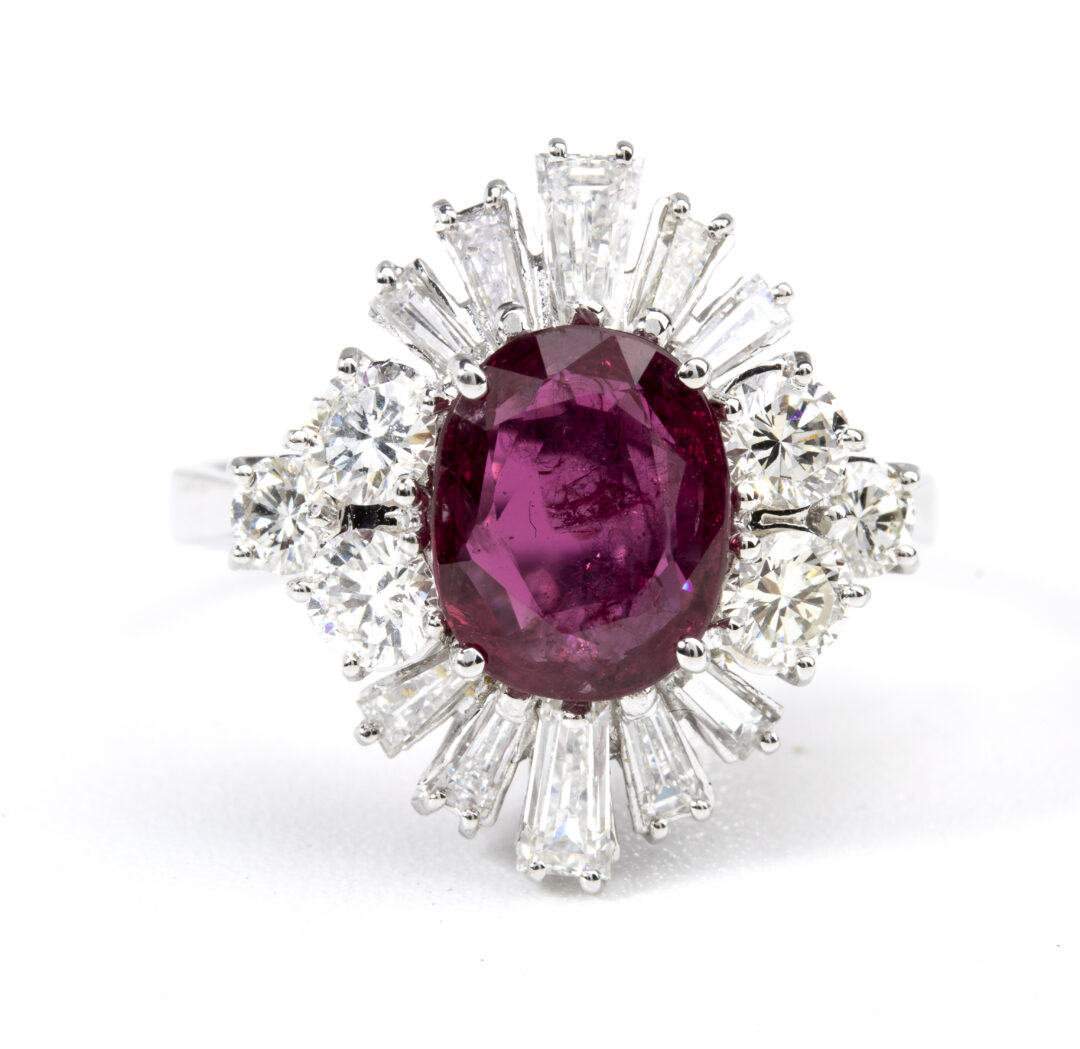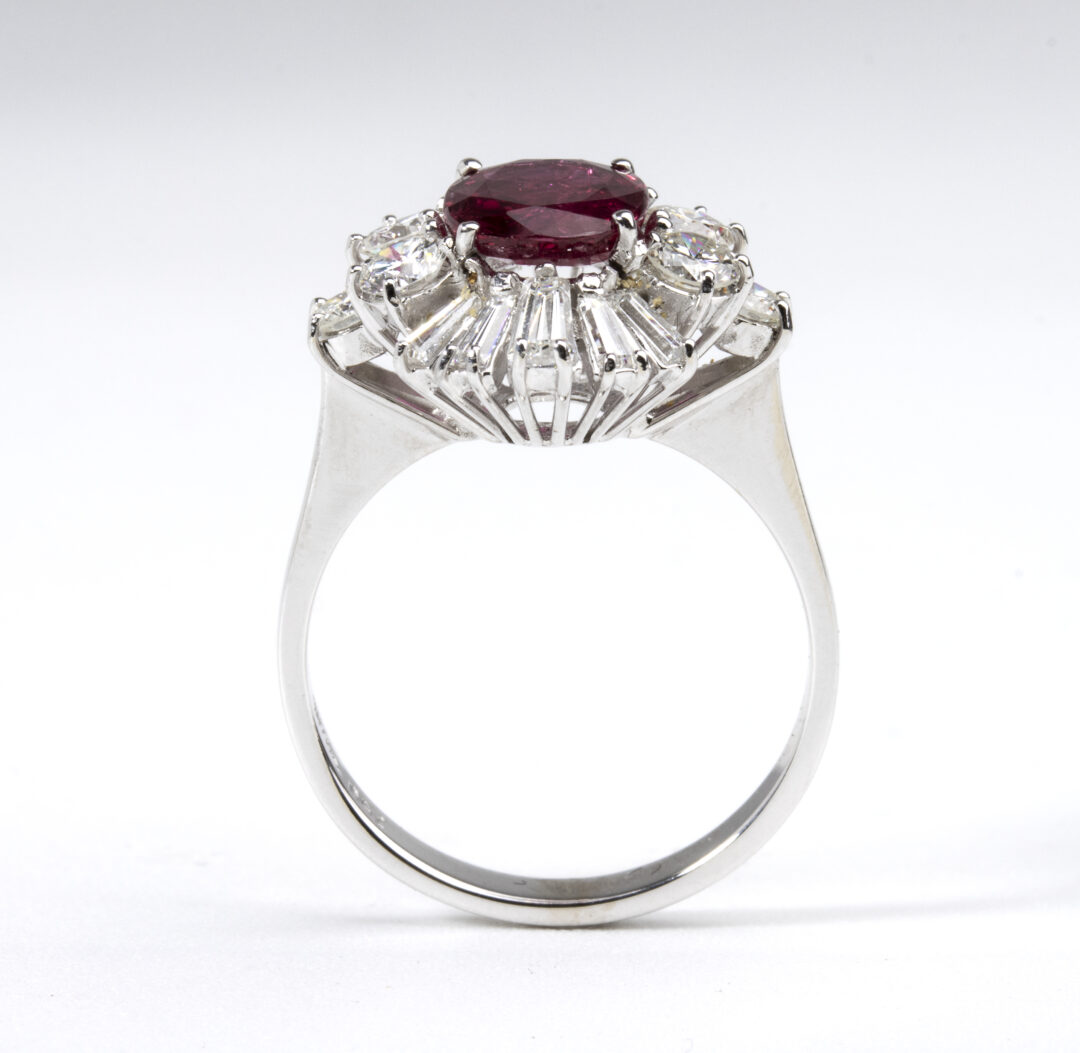 In oro bianco 18kt con rubino thailandese centrale e diamanti