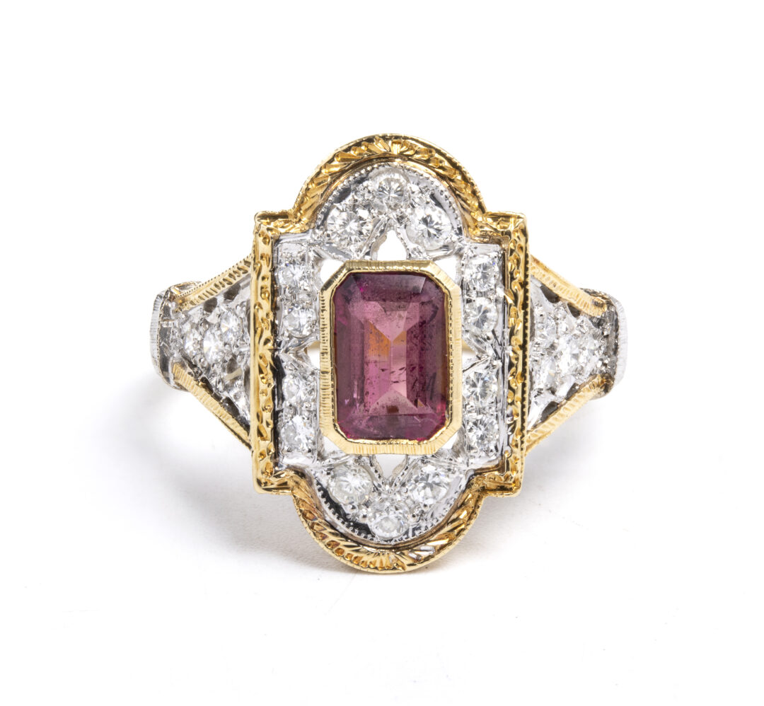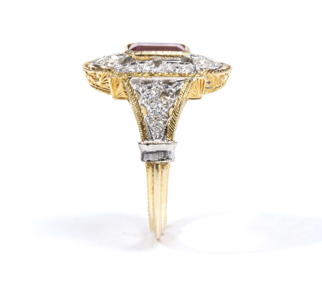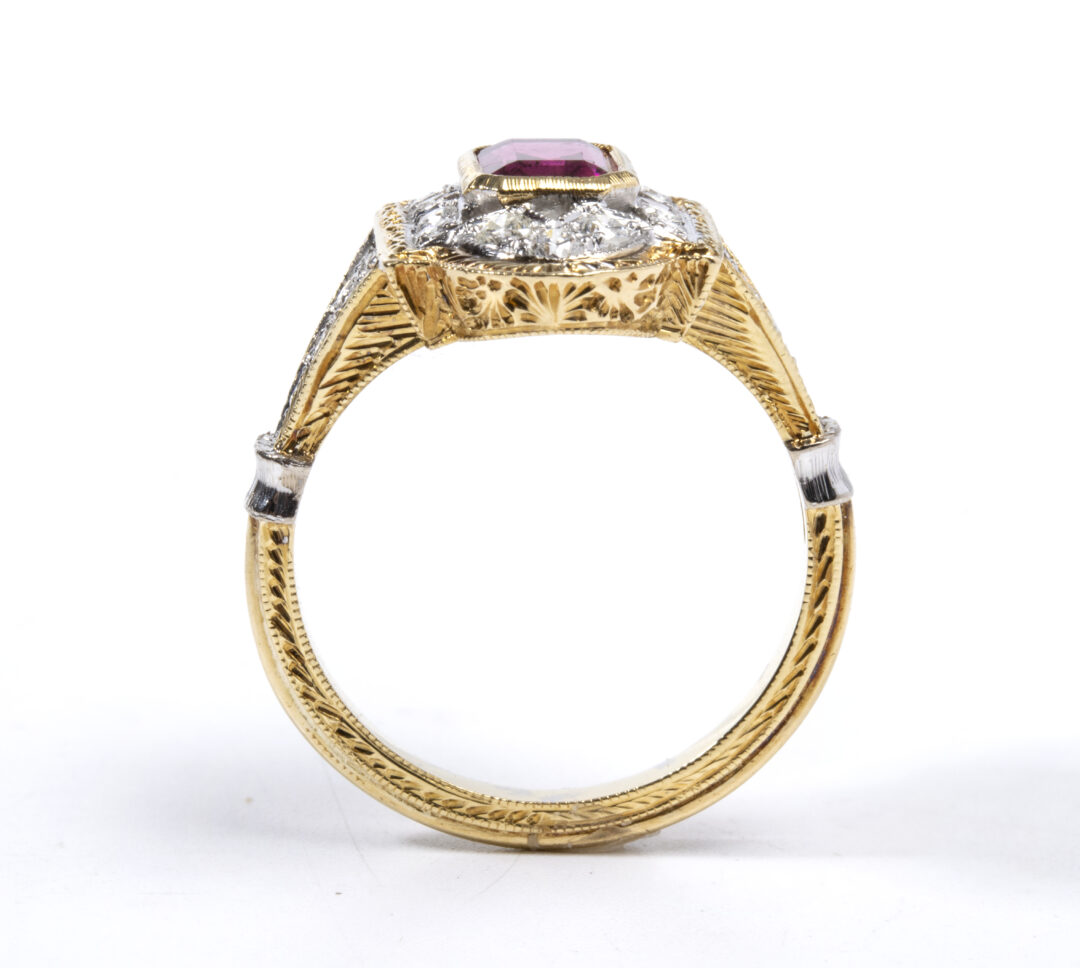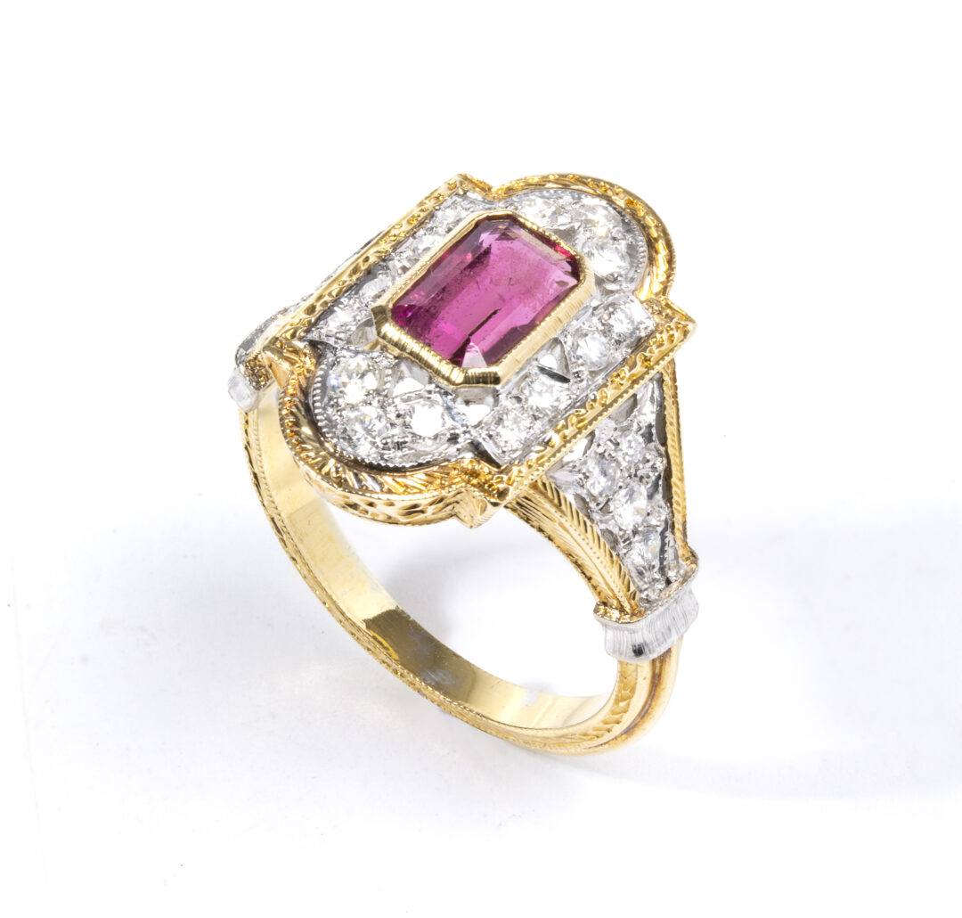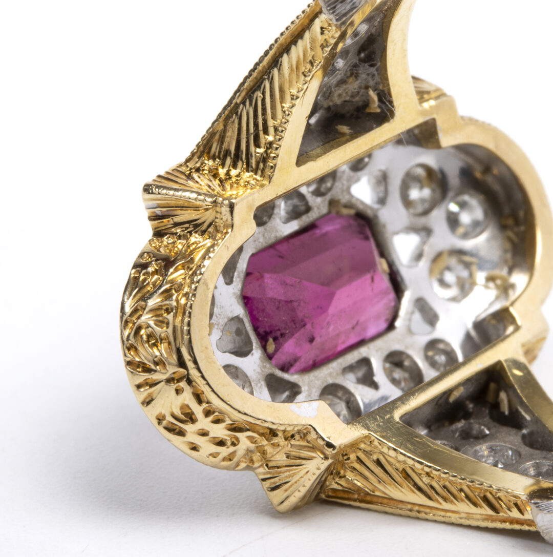 in oro bianco e giallo 18kt con rubino centrale e diamanti