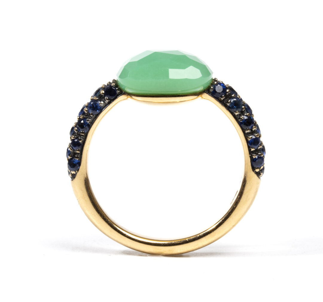 Pietre: Crisopasio centrale 11x11mm e pavè di zaffiri 0,60ct