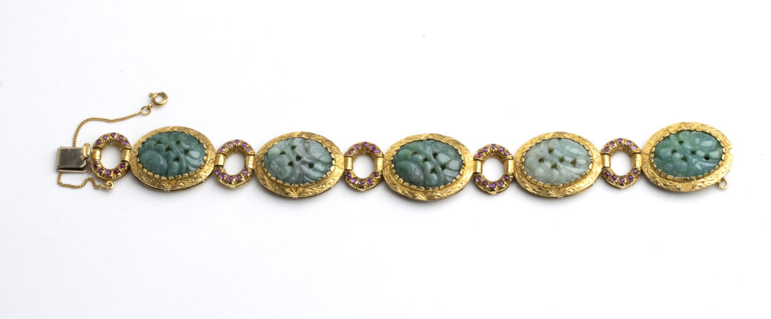 cesellato a mano in oro 18kt con incastonate delle giade ovali incise e rubini cabochon
